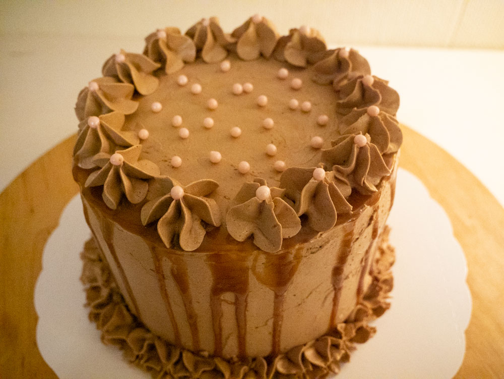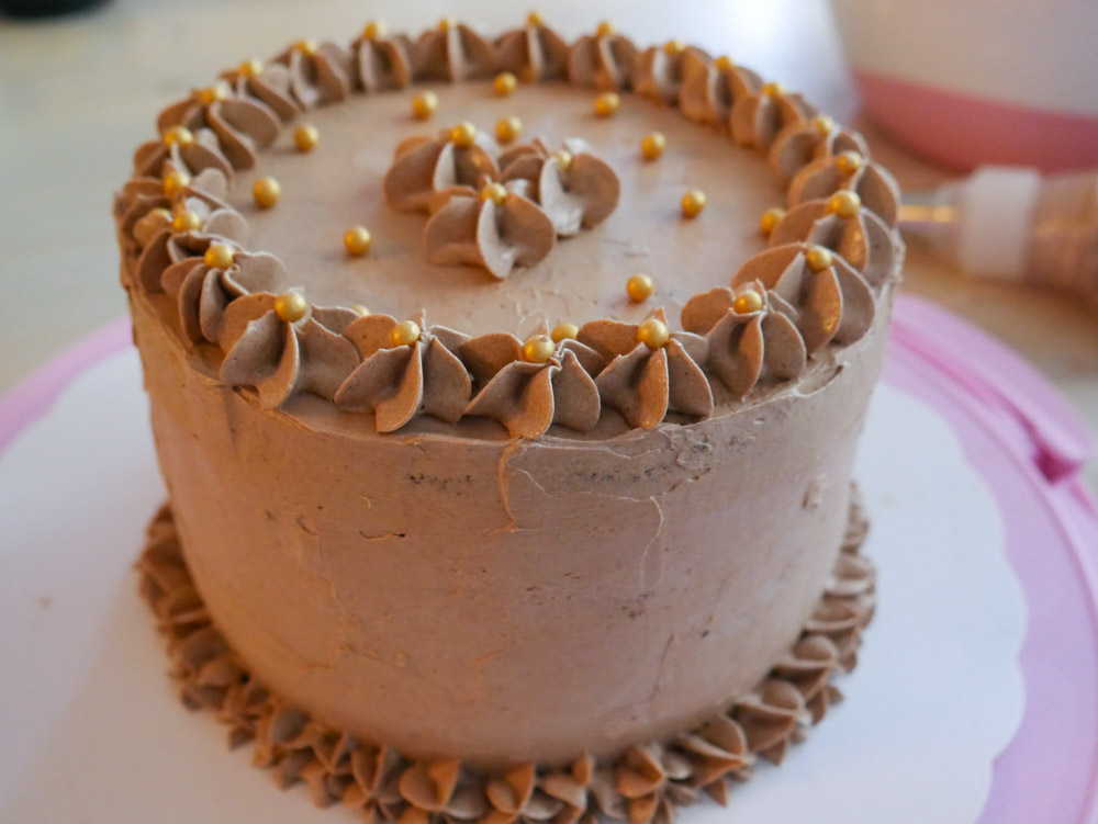 Koristele kakku tekemällä pursotuksia jäljelle jääneellä kreemillä. Lisää muita koristeita mielesi mukaan.