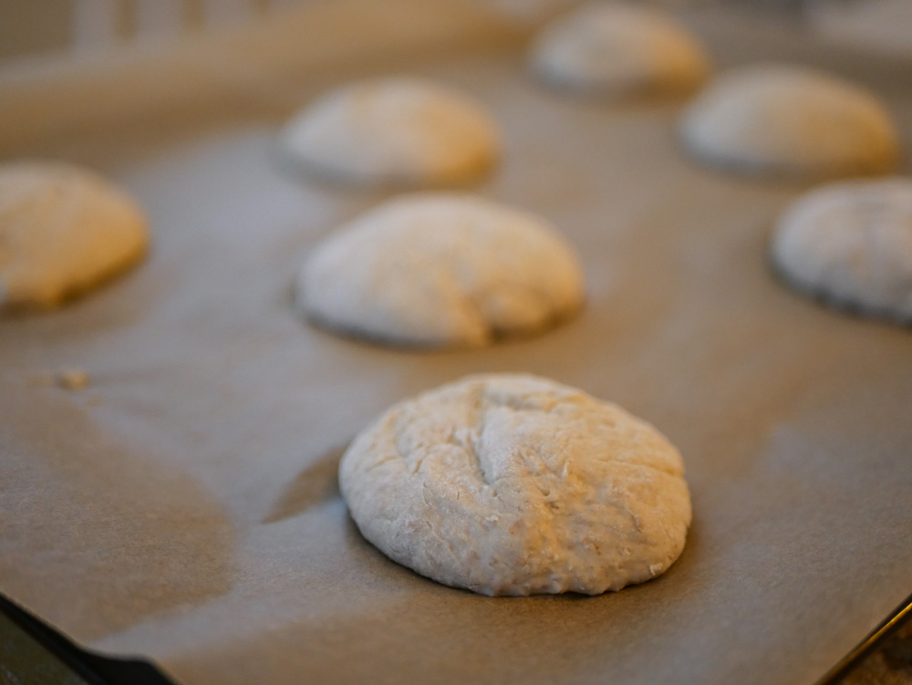 Muotoile taikina sämpylöiksi, lisää tarvittaessa hieman jauhoja, jos taikina tarttuu käsiin. Ei tarvitse kohottaa uudelleen ennen uuniin laittoa. Voitele sämpylät juoksevalla margariinilla tai voisulalla. Laita vettä laakeaan astiaan uunin pohjalle. Paista 200 asteisessa uunissa kunnes sämpylät saavat hieman väriä ja tuntuvat keveiltä.