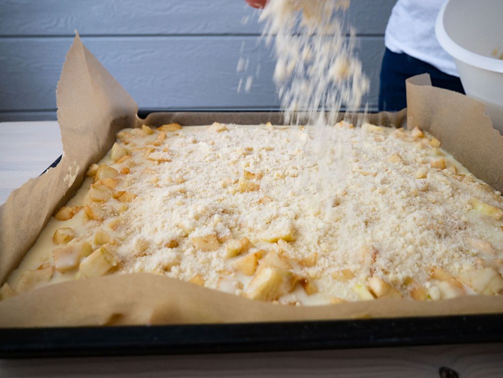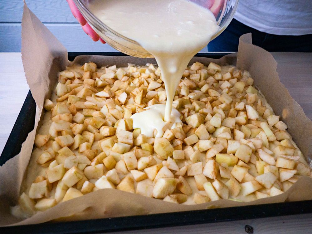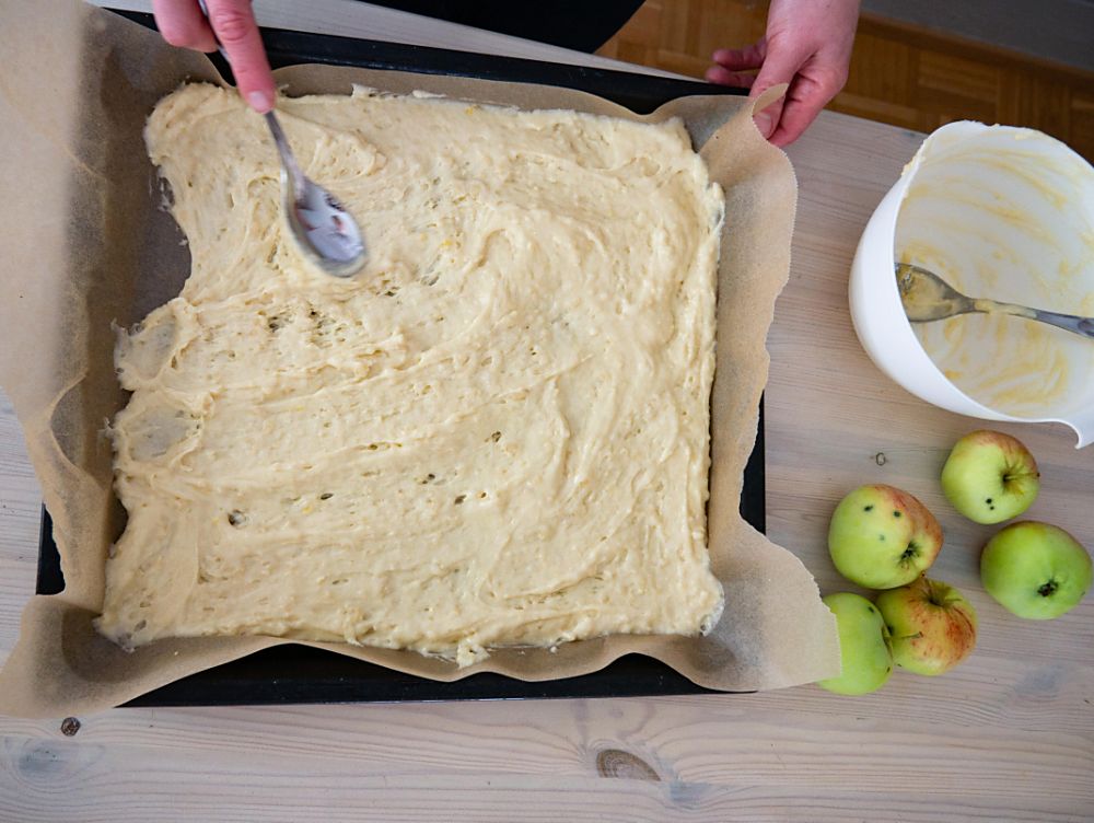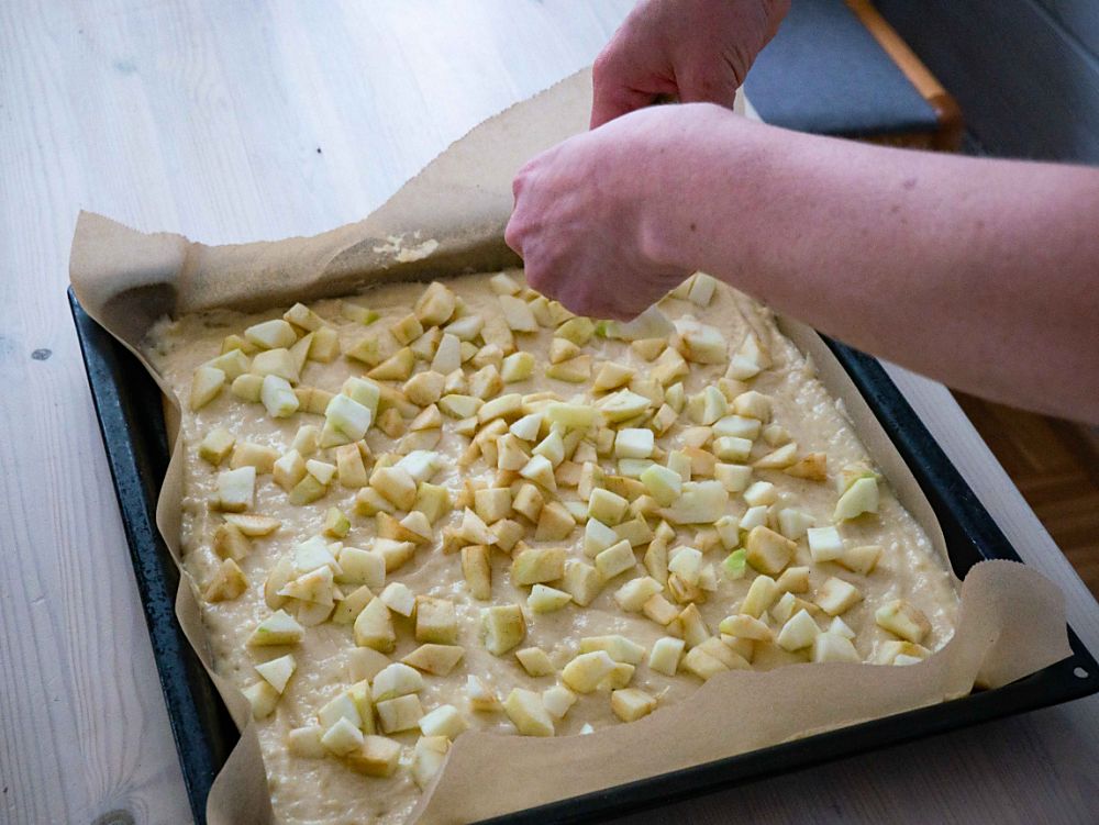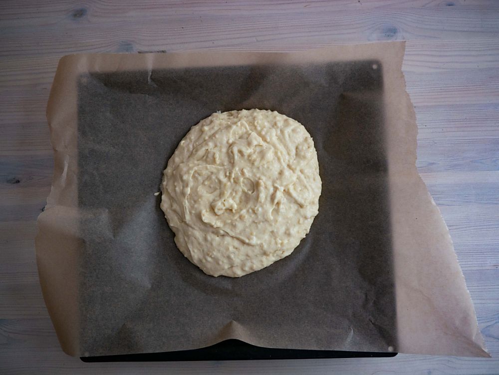 Sekoita pohjataikinan aineet ja taikina kahtia. Lisää toiseen osaan 1 lasi piimää ja yksi muna. Kippaa pellille. Laita päälle omena- tai raparperipalat.