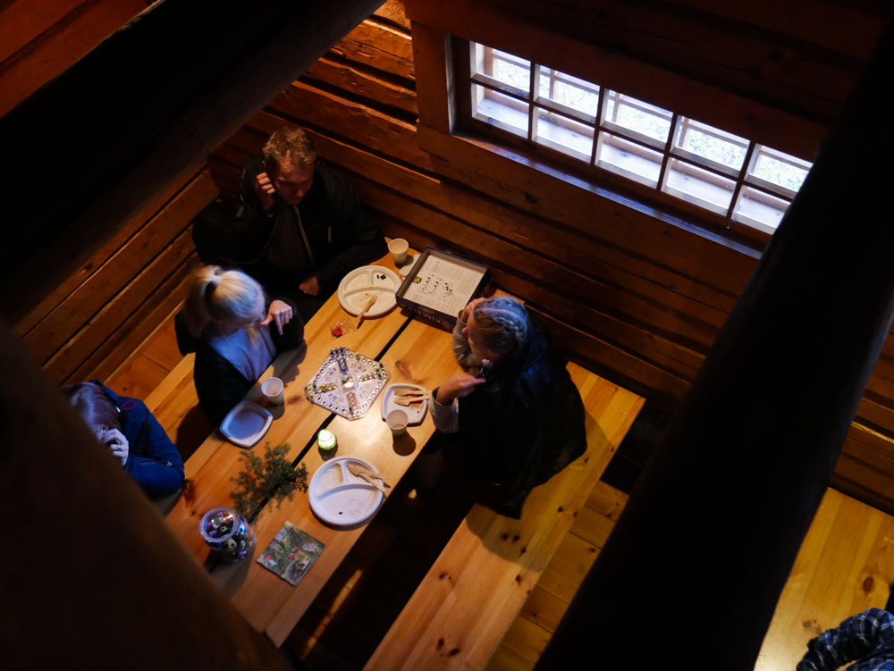 Poutainen mutta marraskuisen harmaa sää houkutti osan vieraista kiertämään ulkoilualueen reittejä, osa istahti mieluummin takkatulen ääreen ja tarjoilupöydän läheisyyteen. Yhtä kaikki, punan sai poskille kuitenkin. Täysi tupa lämpeni mukavasti tulesta ja ihmisten lämmöstä. Kantokakun lisäksi tarjolla oli valkosuklaapuolukka-juustokakkua. Tässä kakussa on kaksi yhdessä. Puolukkajuustokakku on kakun sydämenä valkosuklaajuustokakun sisällä. Valkosuklaatäytteen seassa on puolukoita kirpeinä sattumina. Kakun pohja on saanut tavallista tärkeämmän roolin. Kardemummainen keksimurupohja on makuyhdistelmän kolmas elementti, joka ei jää varjoon muilta mauilta.