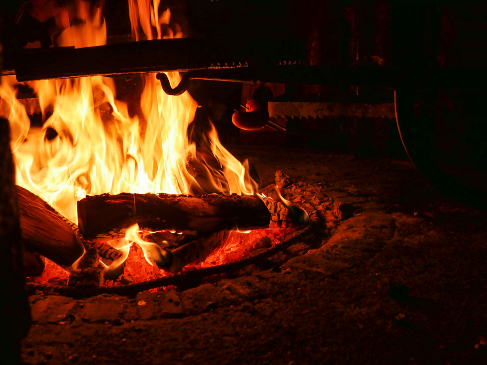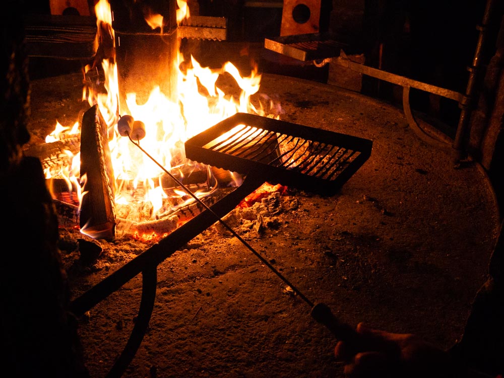 Metsäretken luonnollinen eväs on avotulella paistettu makkara. Takkatuvan avotakan loimuava tuli keräsi ympärilleen makkaranpaistajia ja vaahtokarkin paahtajia. Makkaran kaveriksi tarjolla oli salaatteja, savulohi- ja kana-barbecue kolmiosandwichejä. Metsän henkeä haettiin myös kakuilla. Täytekakut toteutettin puun kantoina, täytteenä karpalo- ja vaniljamousseja, mausteena kuusenkerkkäsiirappipisaroita, päällä kinuskikreemi ja suklaakaarna. Vaikka eteläsuomessa pakkasilla ei marraskuussa toistaiseksi ole käyty, kantokakut tehtiin pakkasen puremiksi. Kaarnaan syntyi kiteistä kuuraa sokerilla ja karpalot koristeltiin huurteisiksi tomusokerilla. Poutasäässä ja +6 asteen lämmössä lumihiutaleista on turha haaveilla, ne syntyivät kuitenkin kakun koristeiksi sokerimassasta muotilla.