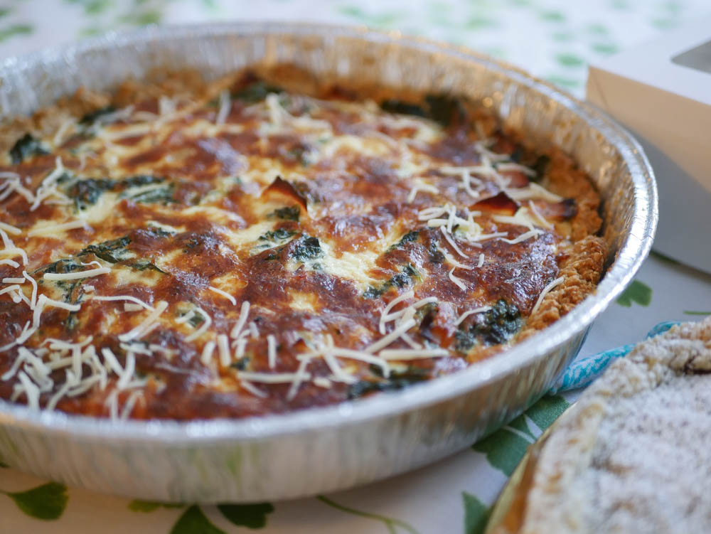 Kanalehtikaalipiirakan pohja tehtiin soveltaen Kaarina Roinisen reseptiä (TV-leipurin helpot kotileivonnaiset 2001). Vehnäjauhojen tilalla gluteeiniton jauhoseos ja tavallisten kaurahiutaleiden sijasta gluteeiniton kauralese. Broileripekoni, joka siis on kanaa, eikä nimestään huolimatta possua lainkaan, paistettiin pannulla lehtikaalin kanssa täytteeksi piirakkaan. Päälle muna-juusto-kerma-seos.