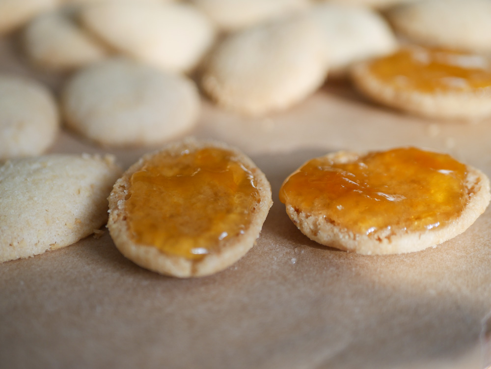 Blogikeittiöstä tuli koekeittiö, kun vanhat tutut leivonnaiset tehtiin nyt nuoren perheen tuoreelle äidillekin sopiviksi. Koekeittiöhengessä kaikki ei mennyt niinkuin Strömsössä. Gluteeinittomista lusikkaleivistä tuli ensimmäisessä erässä pitsilastuja, suussa sulavia mutta ei sitä mitä oli tarkoitus. Mantelijauheen lisääminen taikinaan oli ratkaisu, jolla lusikkaleivät pitivät muotonsa uunissa. Lusikkaleipien väliin sipaistiin aprikoosihilloa.